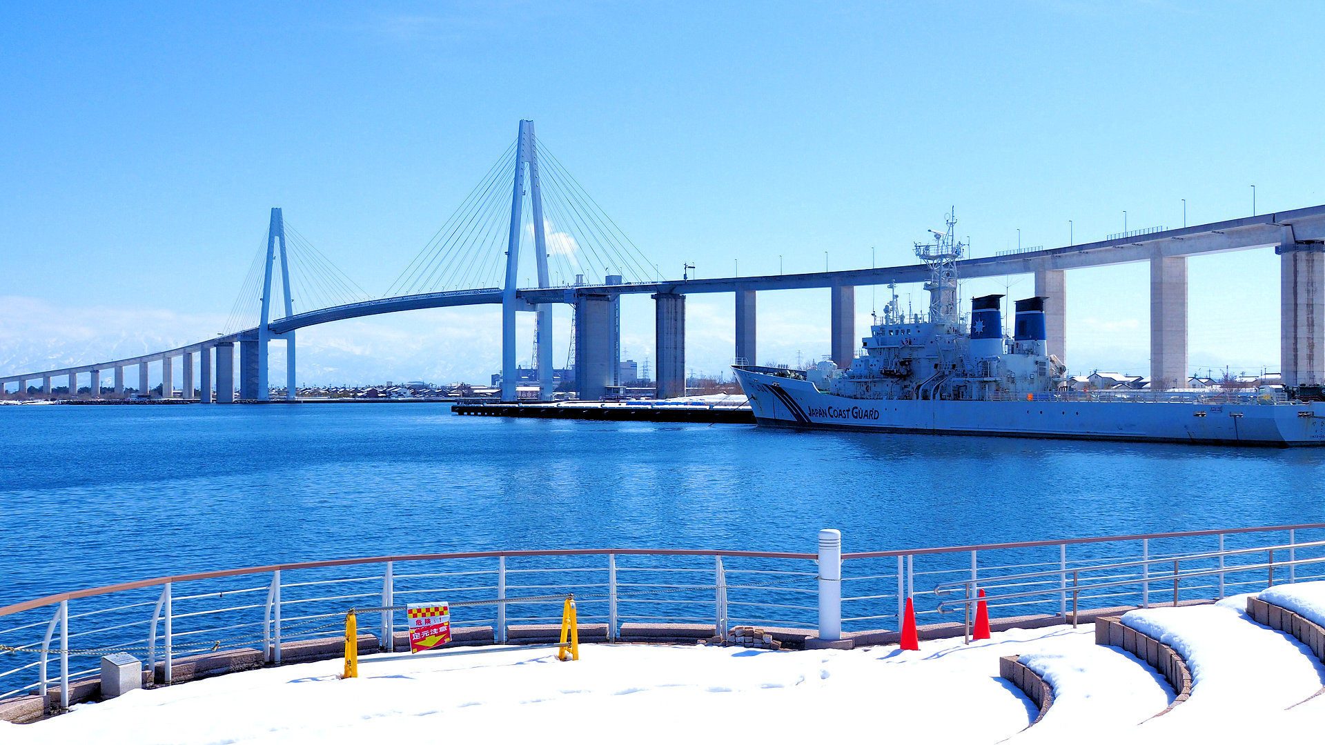 射水市海王町にある海王丸パークから新湊大橋と大型巡視船PL04 やひこ
