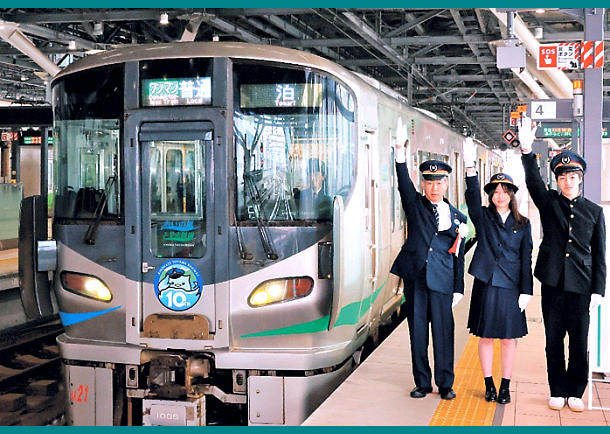 出発式も行われ、係員が泊行きの普通列車に記念のヘッドマークを取り付