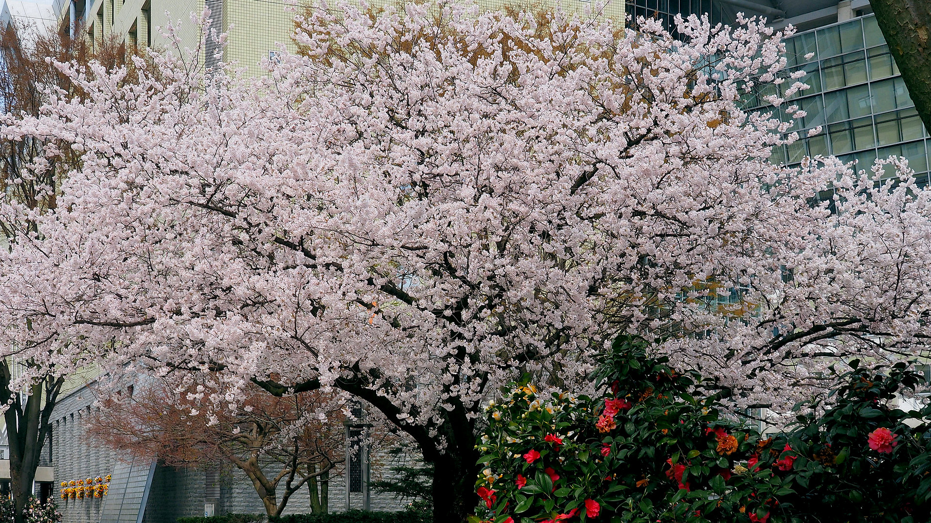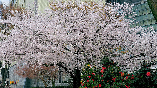 松川べり富山市役所のソメイヨシノとツバキ 2023/03/27 撮影