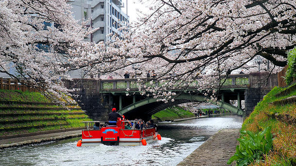富山市松川べりの桜並木 有形文化財 桜橋を通過する松川遊覧船