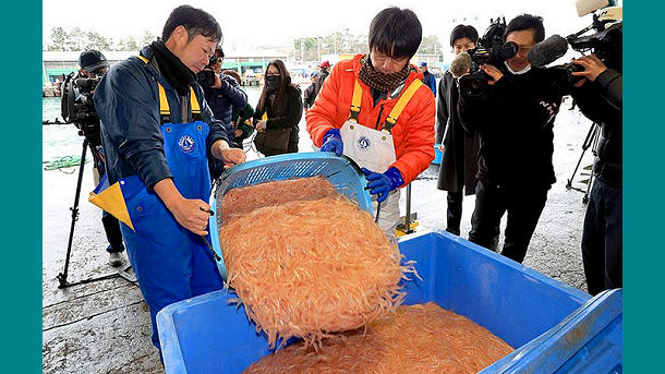浜に宝石帰ってきた 射水・新湊漁港でシロエビ漁解禁