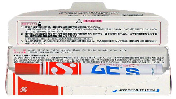 内側に使用上の注意や成分の情報を印刷した「ムヒS」のパッケージ