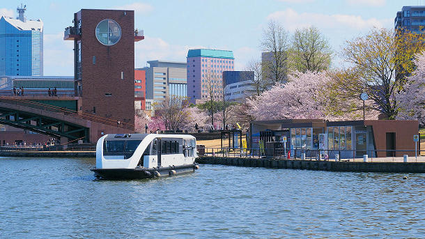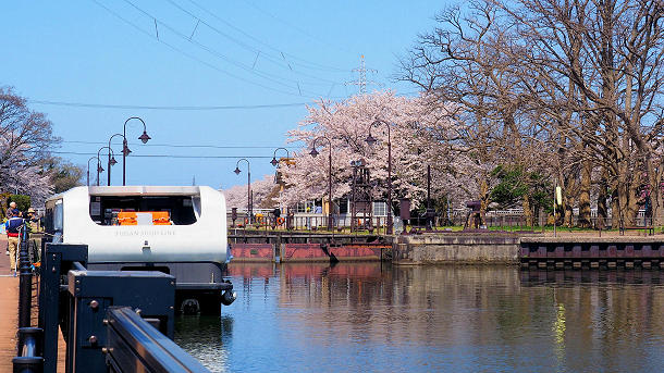 環水公園の桜と出発した遊覧船「kansui」