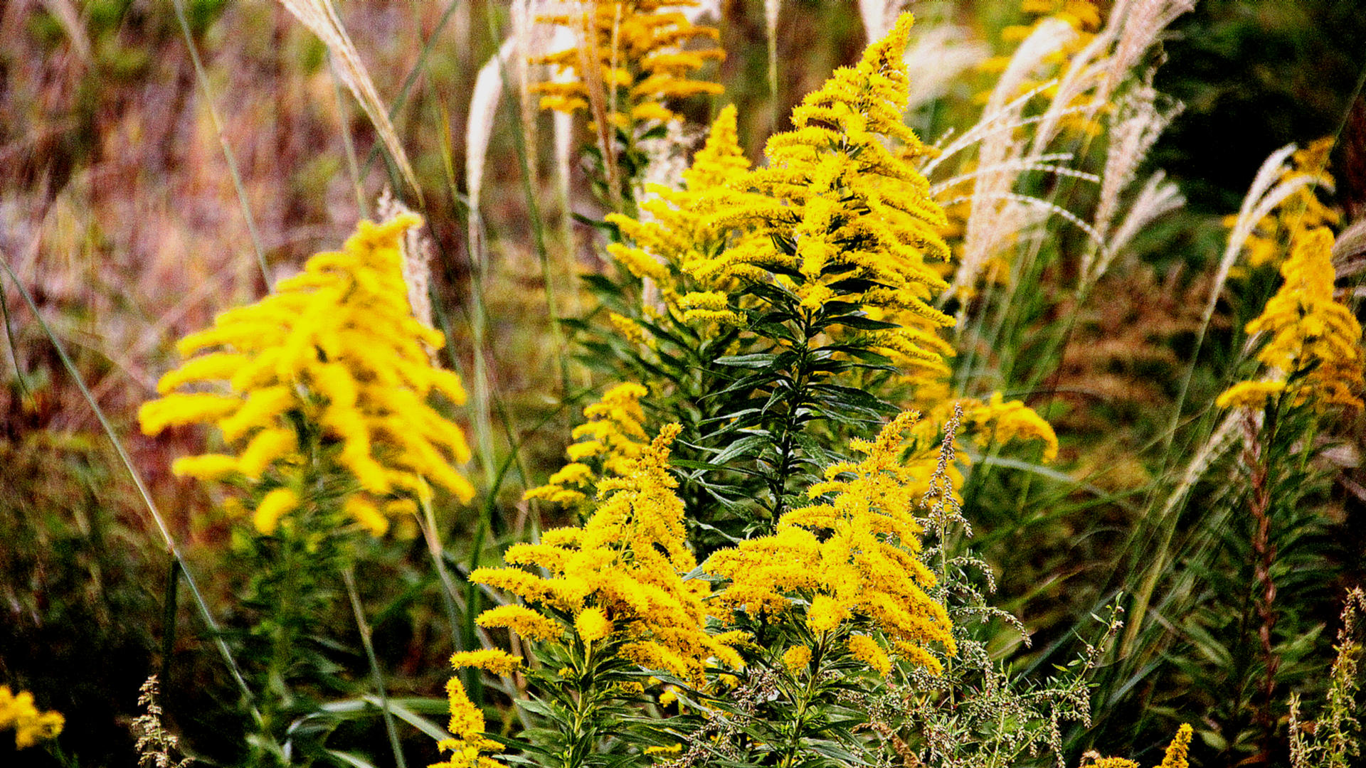 IRいしかわ鉄道森本駅ホームからセイタカアワダチソウとススキ