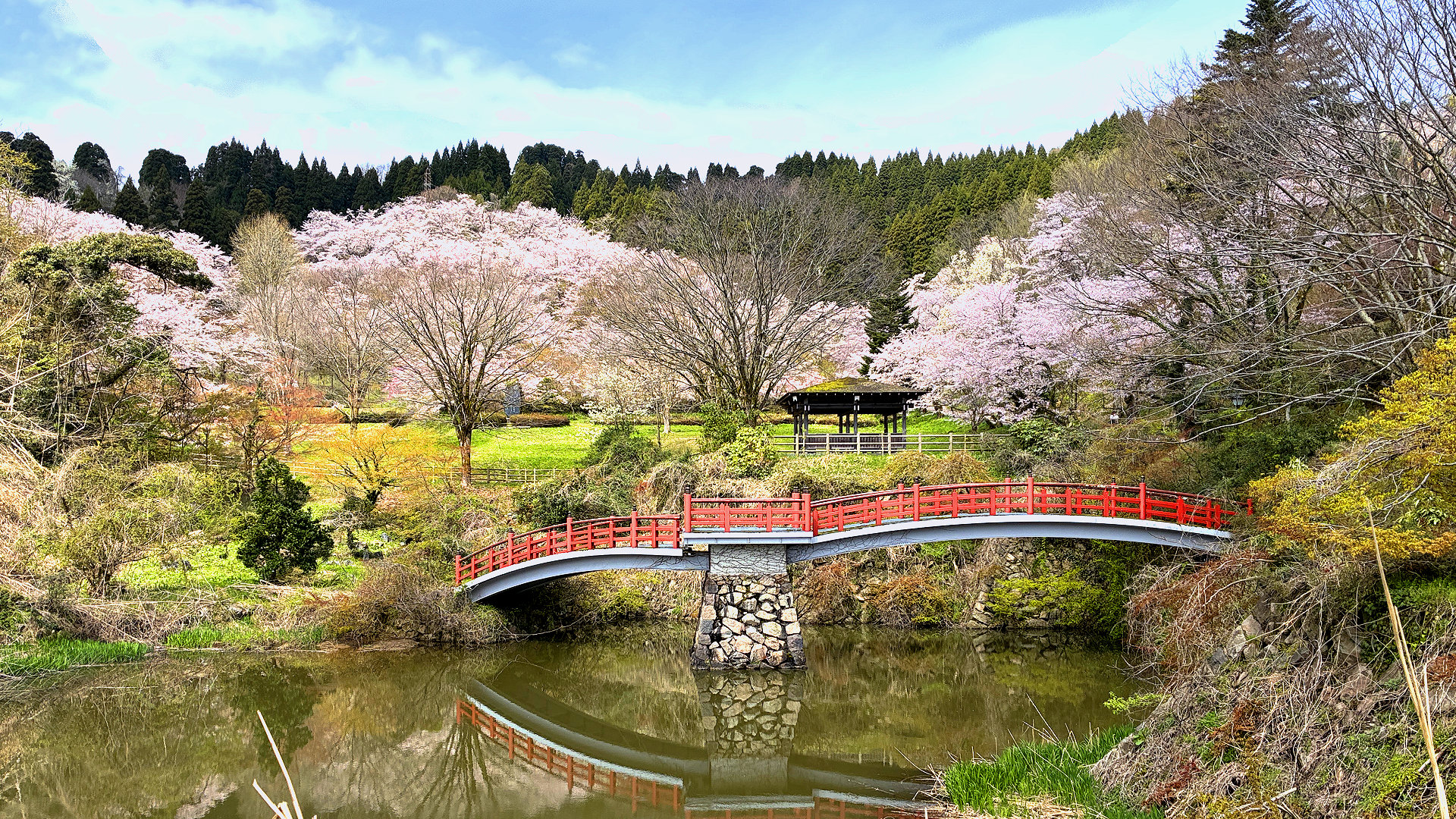 小矢部市城山公園の大谷池に架かる園謝橋越しの桜 2025/04/14 撮影