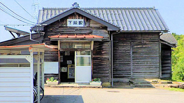 作業後に駅舎を背景に記念撮影し、園児たちは「お花がいっぱい下段駅。