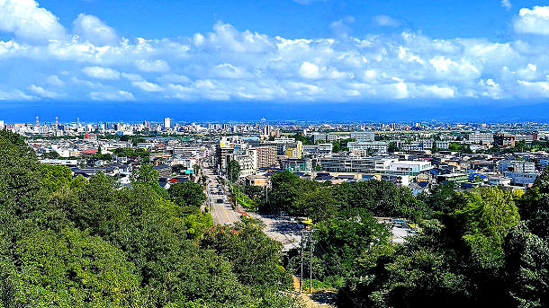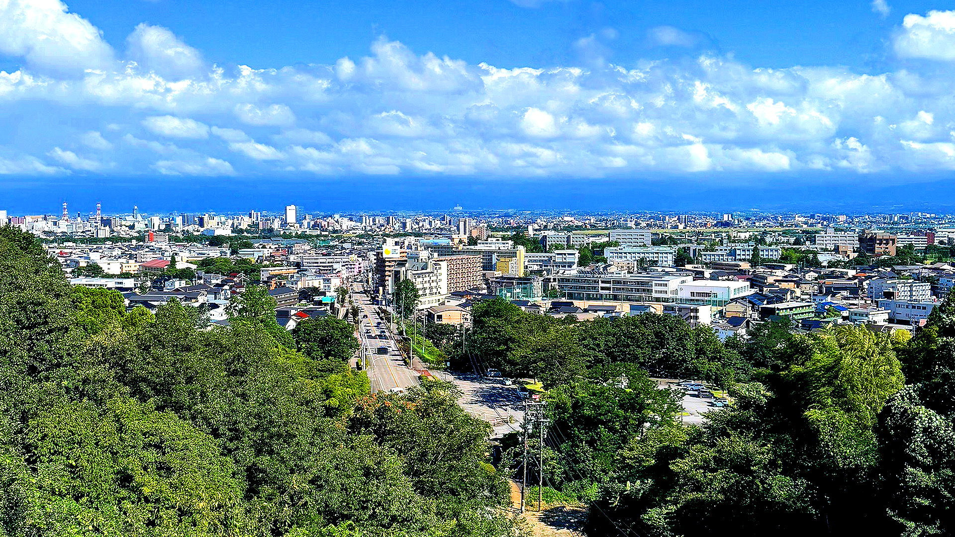 富山県道44号線に架かる呉羽丘陵フットパス連絡橋から富山市街