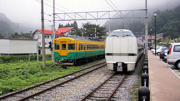 立山線立山駅留置線のJR681系と10030系 1998/08/30 撮影
