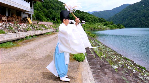 安全を祈り、桂湖をはらい清める利波宮司=南砺市桂大沼