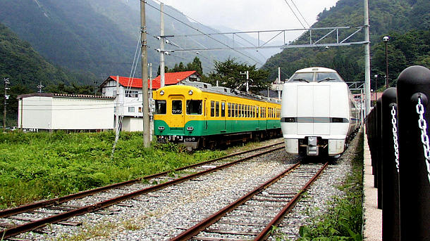 立山線立山駅留置線のJR681系と10030系 1998/09/12 撮影