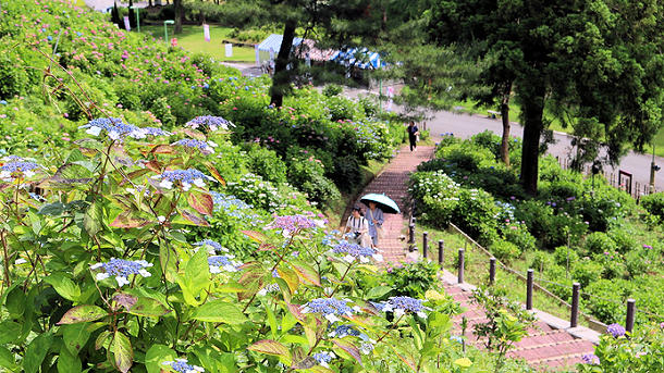 頃になる見込み。来園者は全長500mの「あじさい通り」を歩き、青や紫、