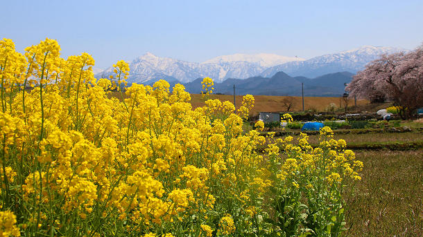 富山市常西合口用水沿いの畑の菜の花 奥に薬師岳 2016/04/06 撮影