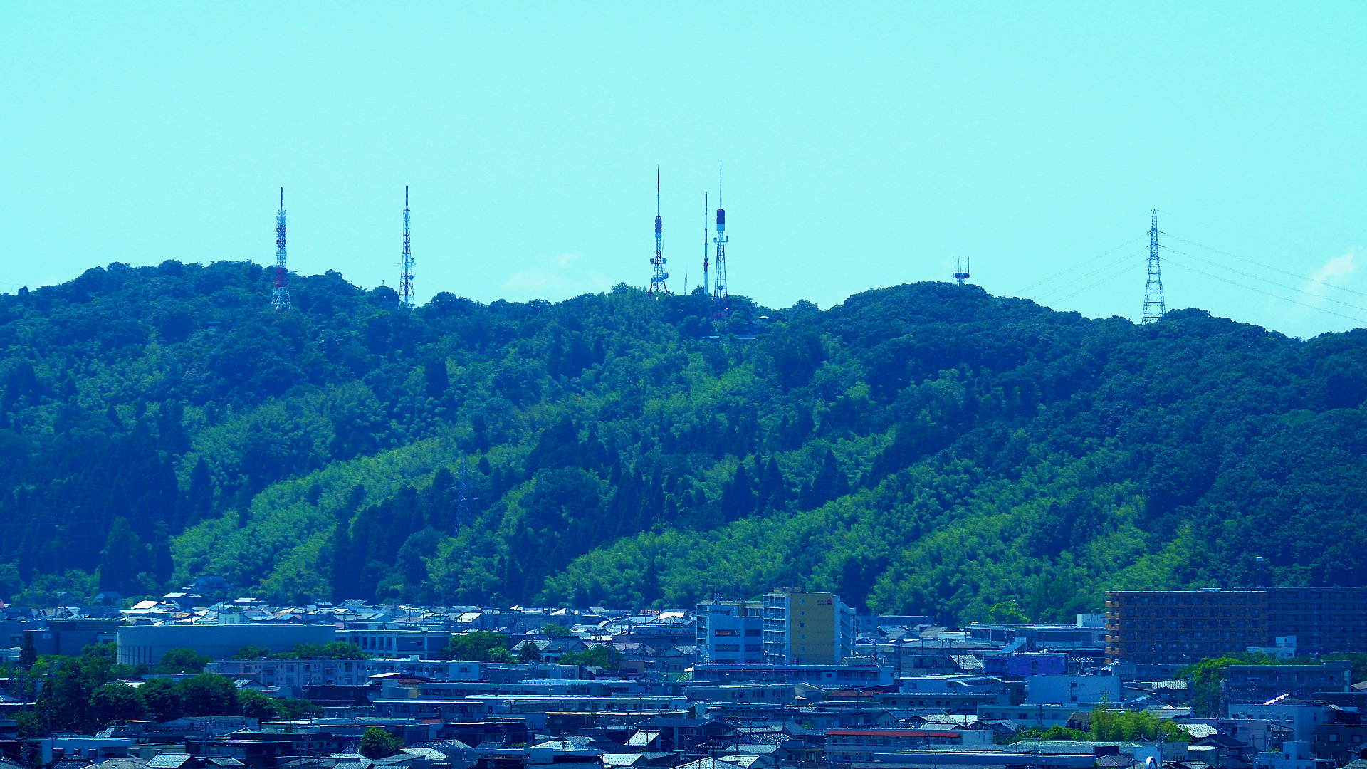 富山市牛島町のアーバンプレイス14階から呉羽山公園の電波塔群。左から
