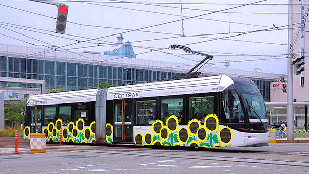 ヒマワリ路面電車出発 地鉄・環状線、「富山もよう」