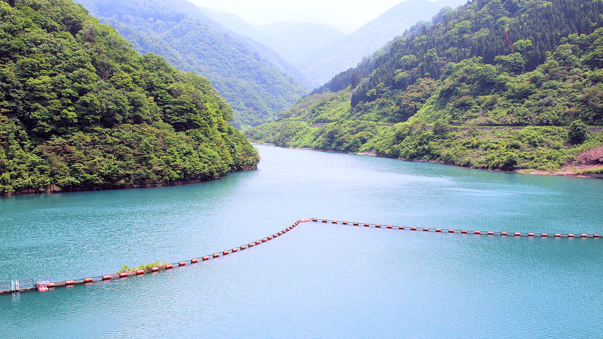 富山県朝日町山崎にある県営朝日小川ダム湖 堰堤天端から上流方向