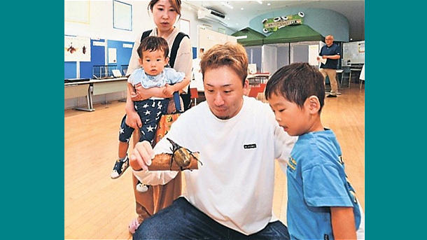 ヘラクレスオオカブトムシを観察する家族連れ