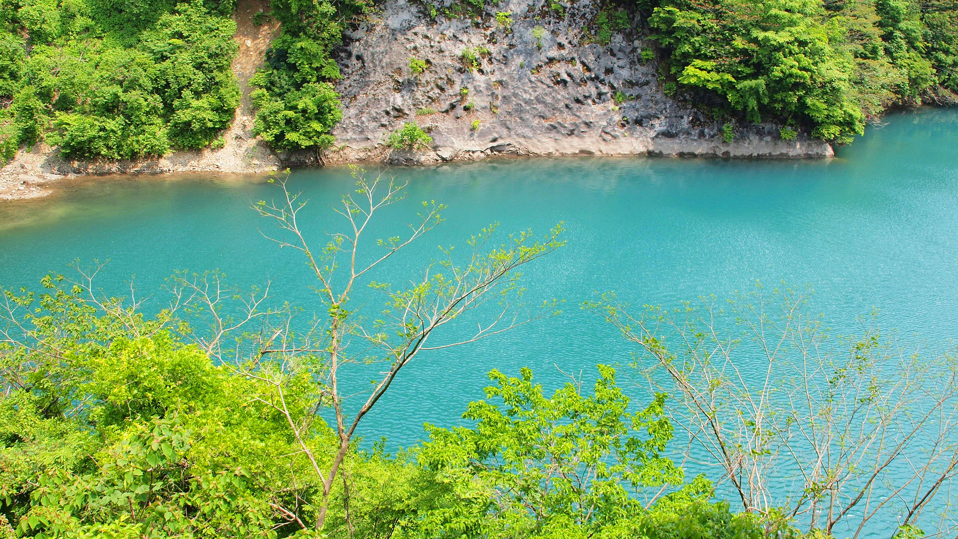 富山県朝日町山崎にある県営朝日小川ダム湖 流木処理場付近からダム湖