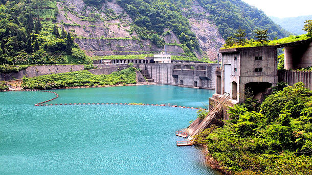富山県朝日町山崎にある県営朝日小川ダム湖右岸の阿造谷橋付近から