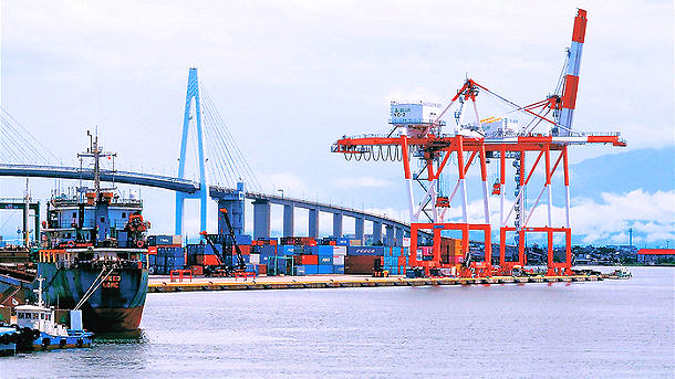 ヒアリが確認された富山新港国際物流ターミナル。後方は新湊大橋