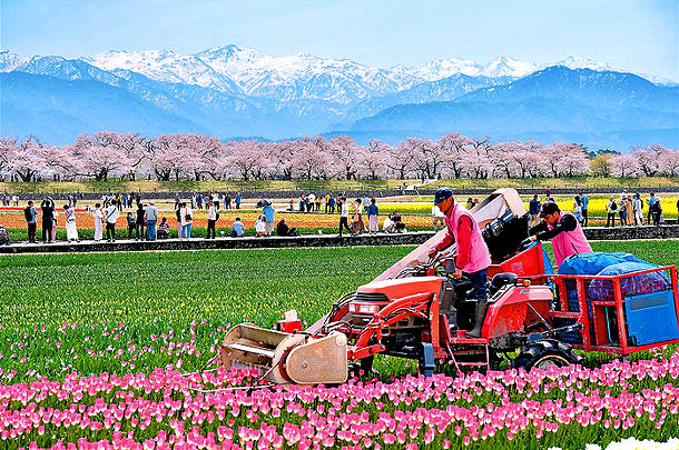 「春の四重奏」の絶景が広がる中、乗用農機具でチューリップの花を摘み取