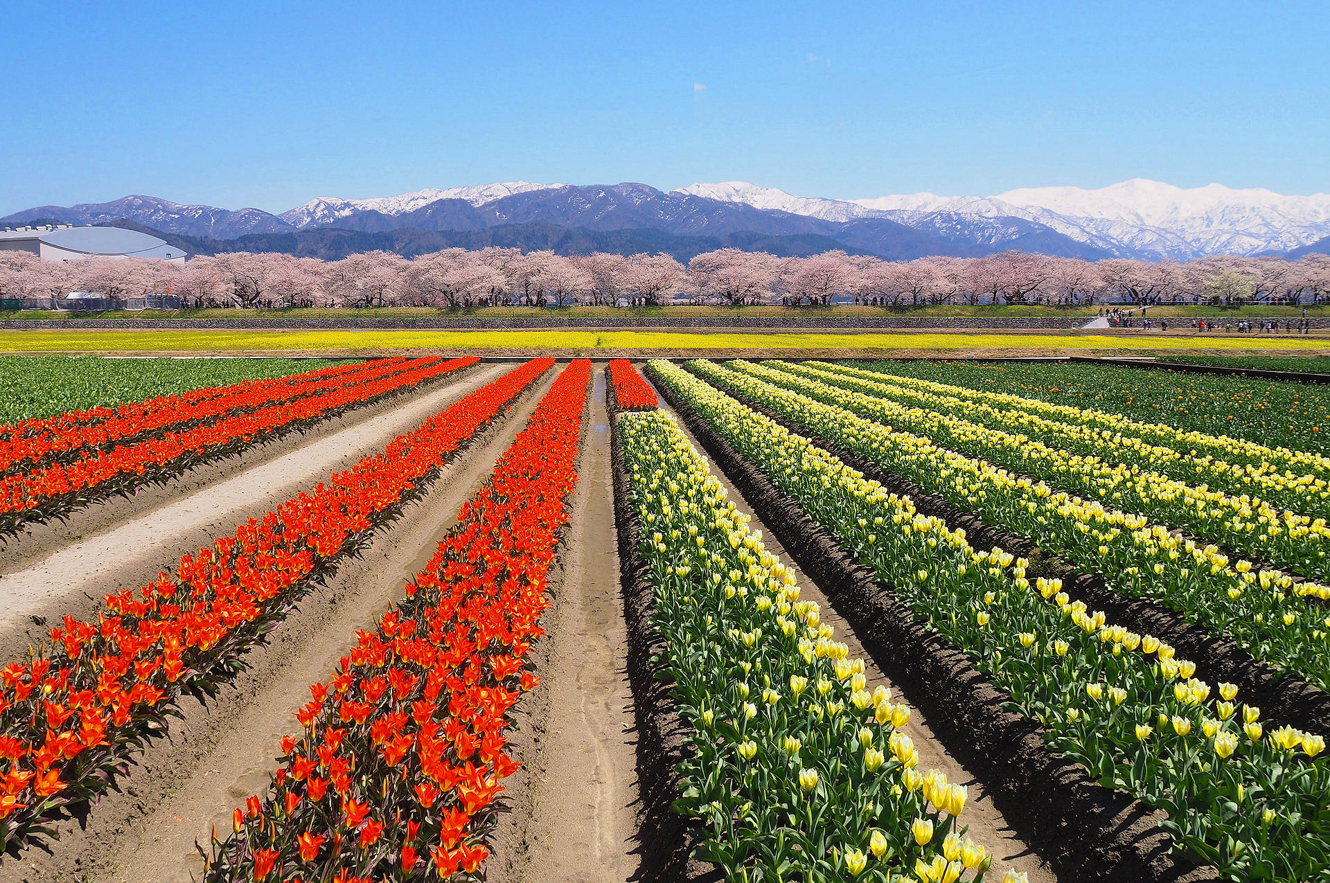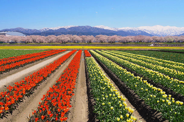 広いチューリップと菜の花を植え、舟川の桜と一緒に咲かせようと試みたの