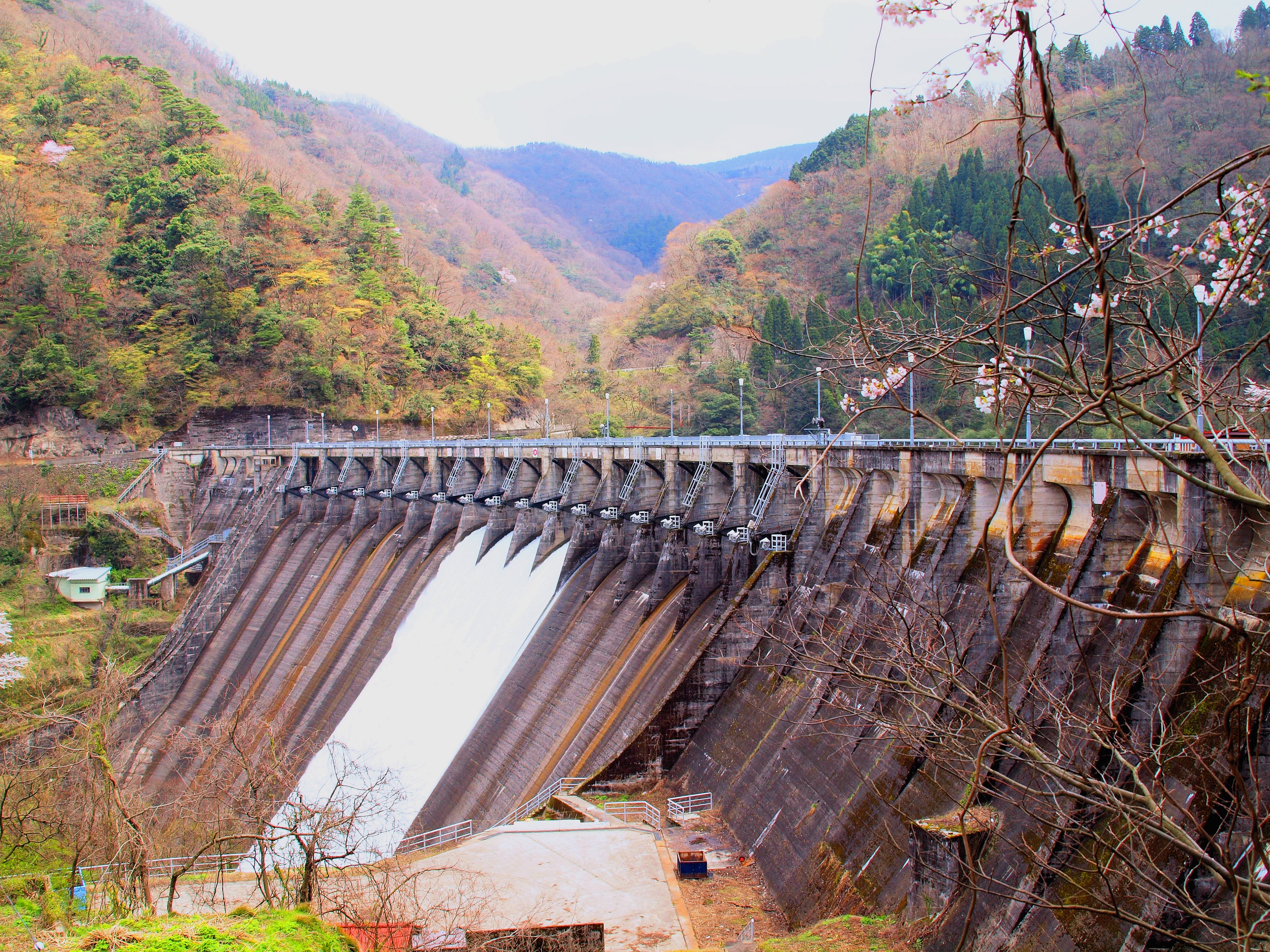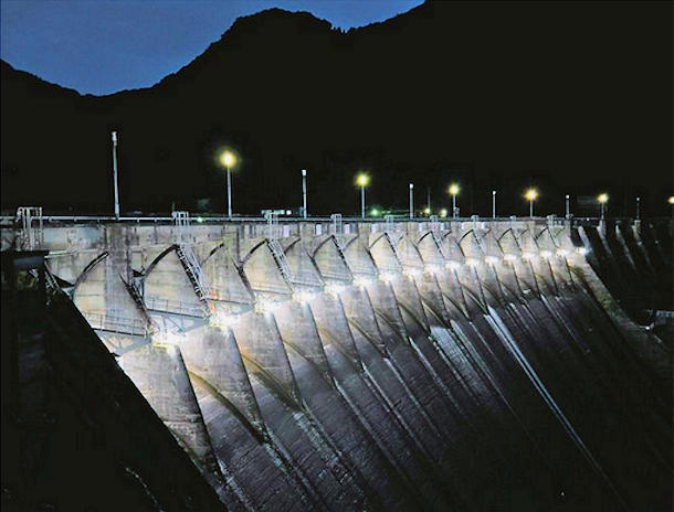 イトアップを始める。かつて「東洋一」と称されたダムが夜の闇に荘厳に照