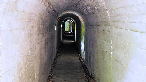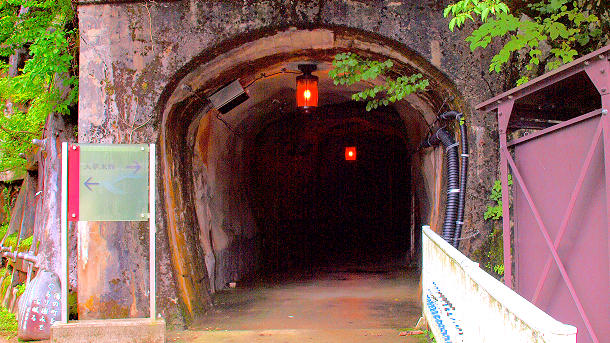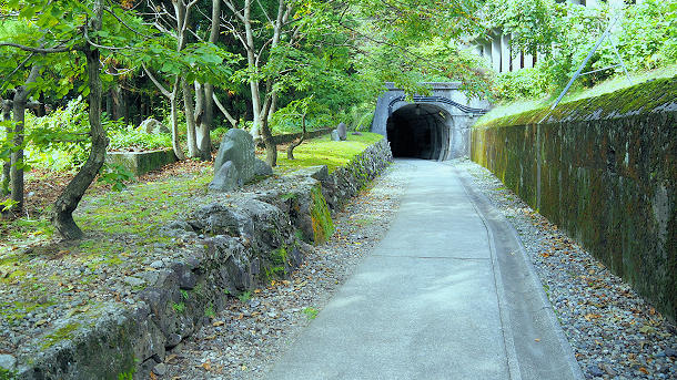 山彦橋を渡ると旧第1トンネル ←遊歩道未整備で案内なし、→大夢来館と