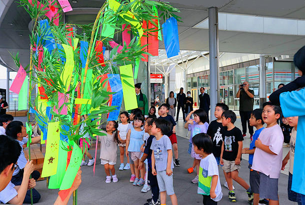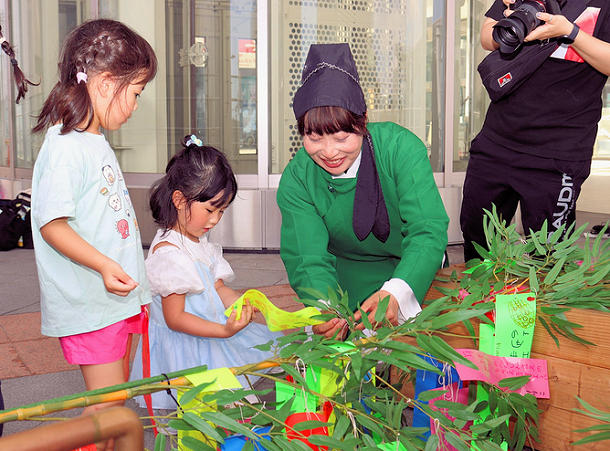 キで、願い事を書いた短冊を七夕飾りに付けた。8月7日まで万葉線高岡駅