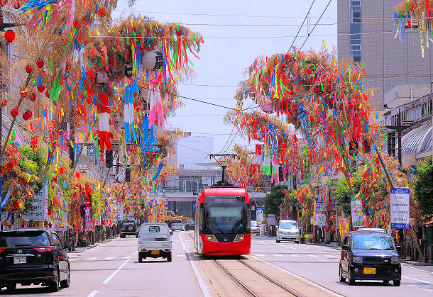 高岡市中心部で開かれる「高岡七夕まつり」七夕飾りと万葉線電車