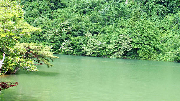 ている。右岸は砺波市庄川町庄で湖岸から林道まで約400m離れており、