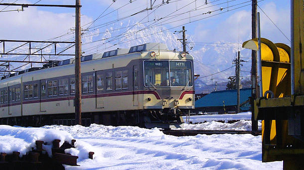 上市駅を発車した14771+14772電鉄富山行き 1999/01/17 撮影