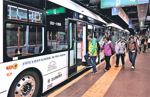 電気バスに続々と乗り込む観光客=室堂ターミナル