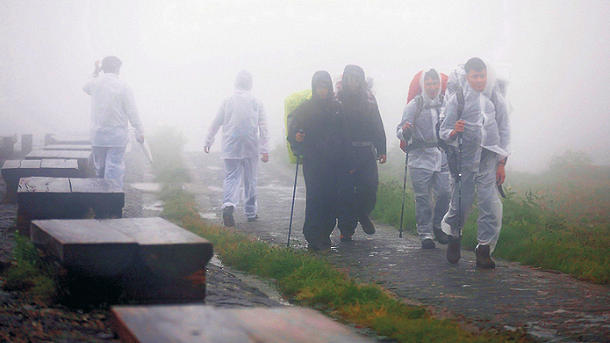 濃い霧と雨風の中、遊歩道を歩く登山客=立山・室堂(法野悠人撮影)