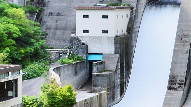 ② 出平ダム排砂ゲート 樹木に隠れ正面から見えない 河川維持水を利用