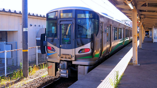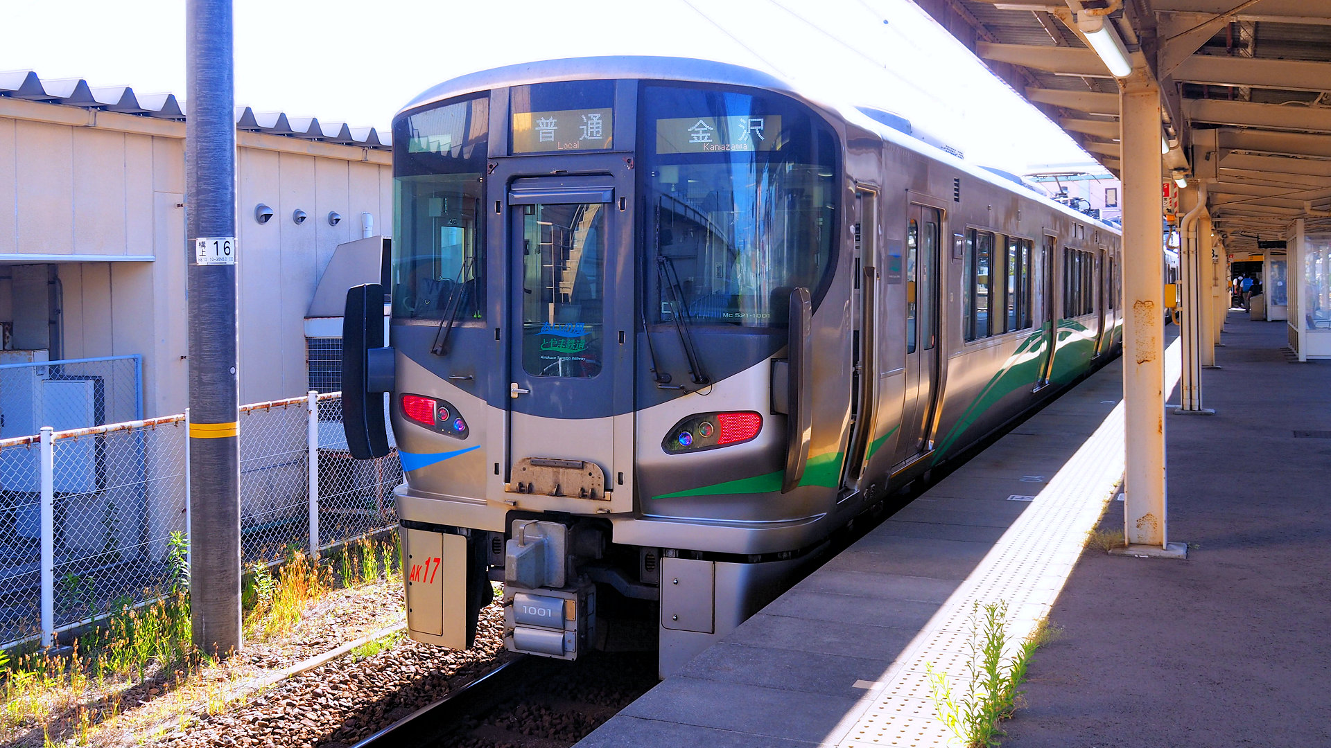 あいの風とやま鉄道小杉駅を発車する521系AK17+AK14編成金沢行き