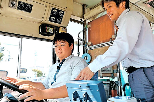 先輩社員(右)の指導を受けながら初めて自社バスの運転に臨む碓井さん