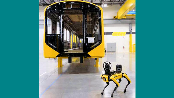 日立製作所の工場で鉄道車両の自動品質検査に活用される犬型ロボット