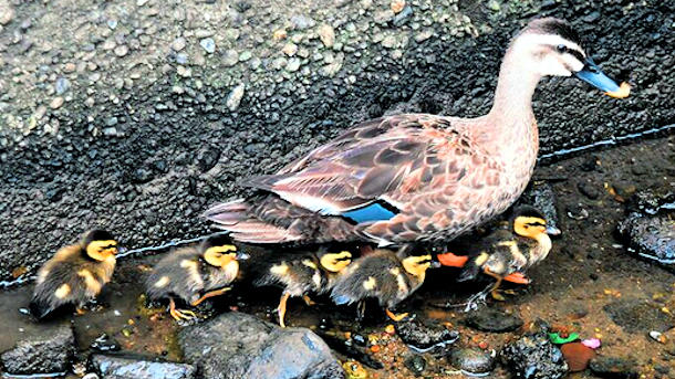 季節外れ、カルガモすくすく 富山市の神社にひな5羽