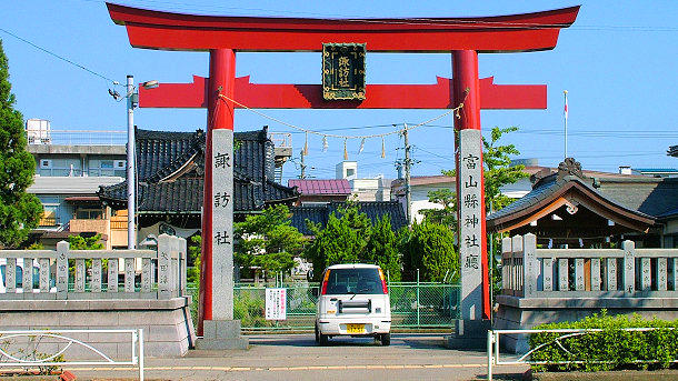 富山地方鉄道市内電車諏訪川原電停前の諏訪社