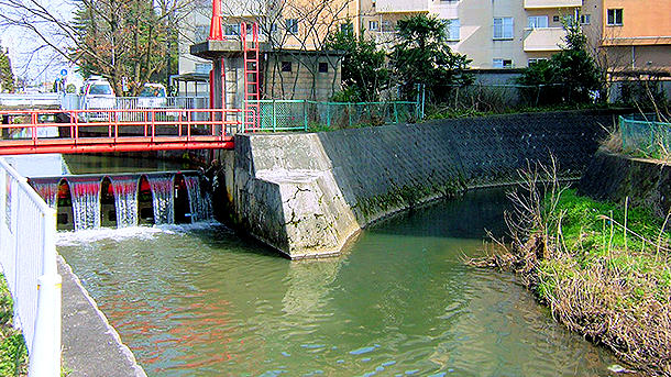 左側四ツ谷川と右側冷川の合流地点 段差の直前に分流ゲート
