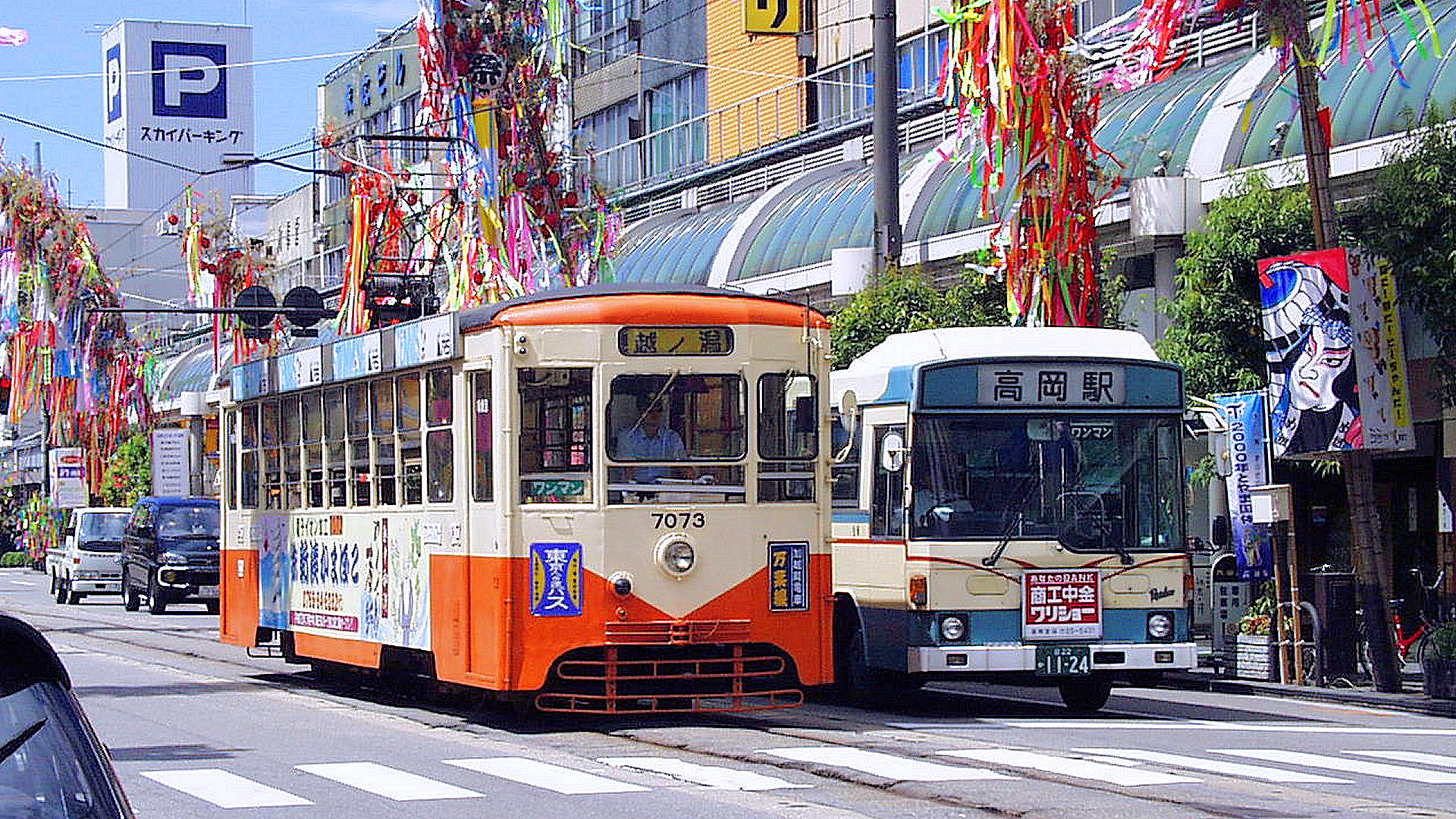 高岡軌道線末広町通りを走る7073高岡駅前−越ノ潟行きと加越能バス