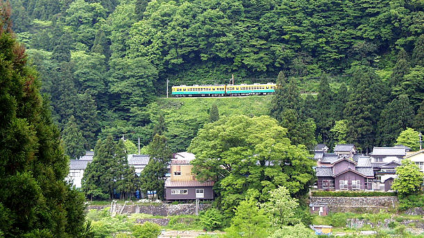 県道67号線から旧斜面に沿って走る地鉄立山線列車 横江駅−千垣駅間
