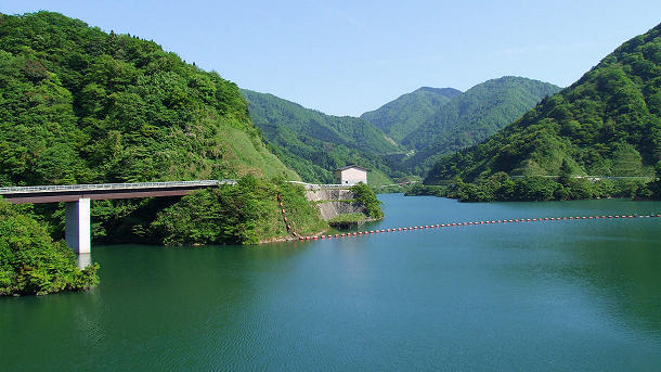 富山市八尾町桐谷の富山県営区久婦須川ダム堰堤道路から上流側