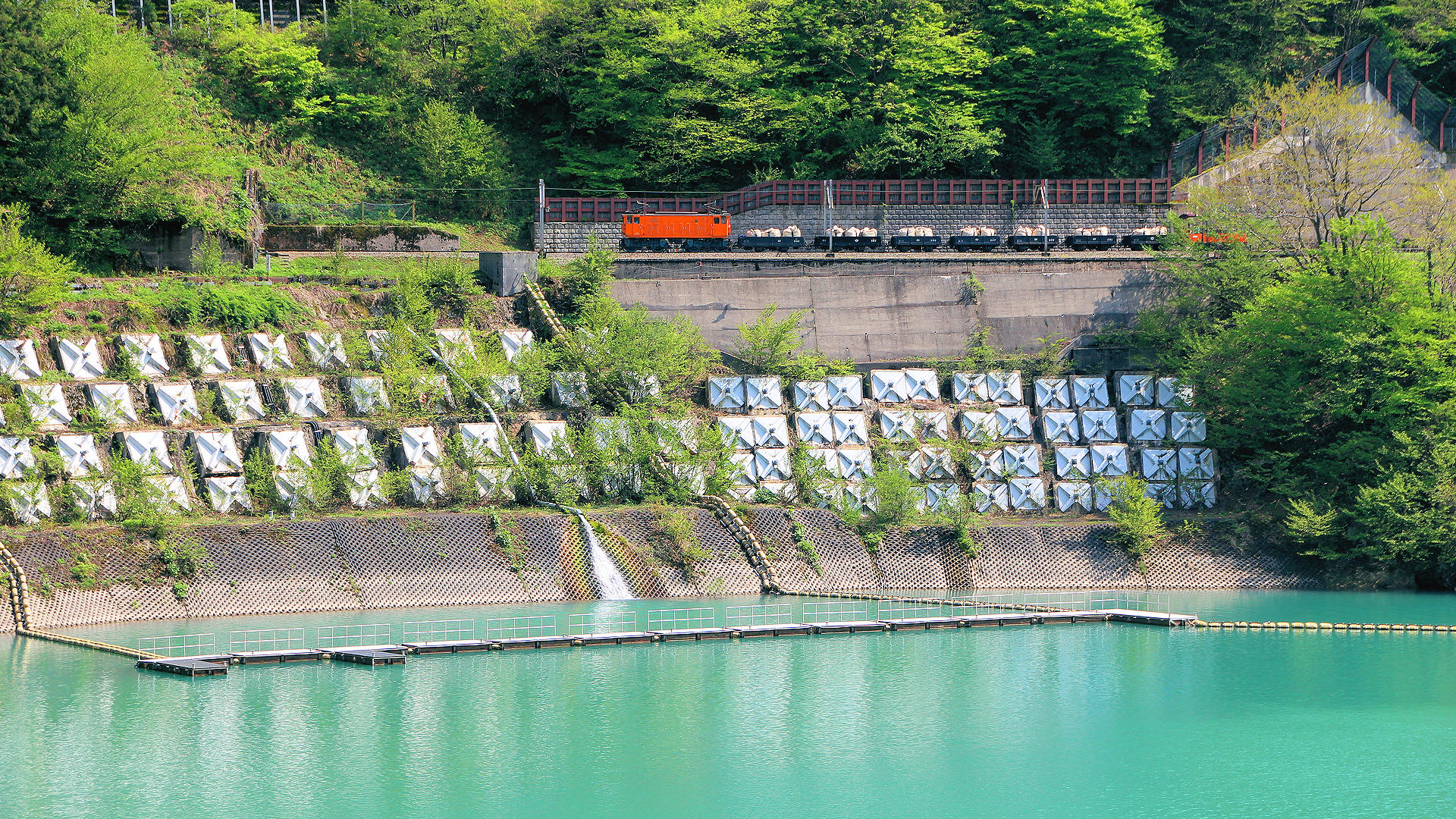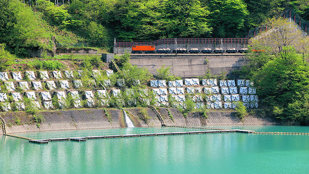 うなづき湖第一展望広場から右岸を走る関西電力専用列車