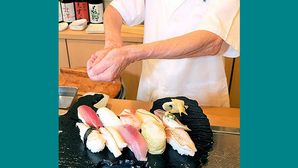 職人が握ったすし。青池学園富山校が教材の開発に乗り出す=富山市一番町