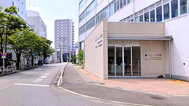 富山市総曲輪4丁目の青池学園の富山校 左は富山市民プラザ