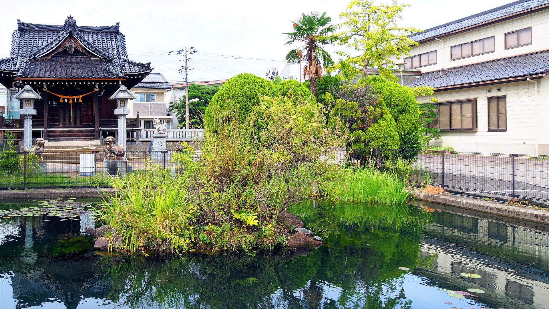 車内から名古屋市昭和区川奈本町にある川原神社の境内社川名弁天社の池に