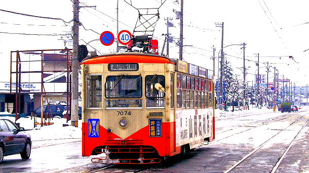 高岡軌道線米島口駅を発車した7074高岡駅前行き 2000/02/19 撮影