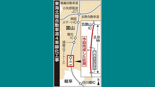 今回4車線化したのは、真木トンネル(1.6km)を含む五箇山ICから
