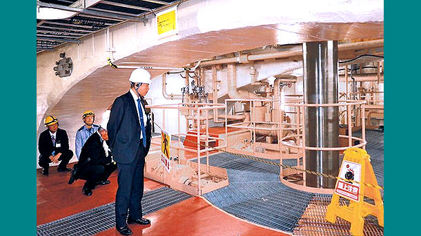 の神事や記念撮影の後、発電所内を見学し、配電設備や発電機、水車の回転